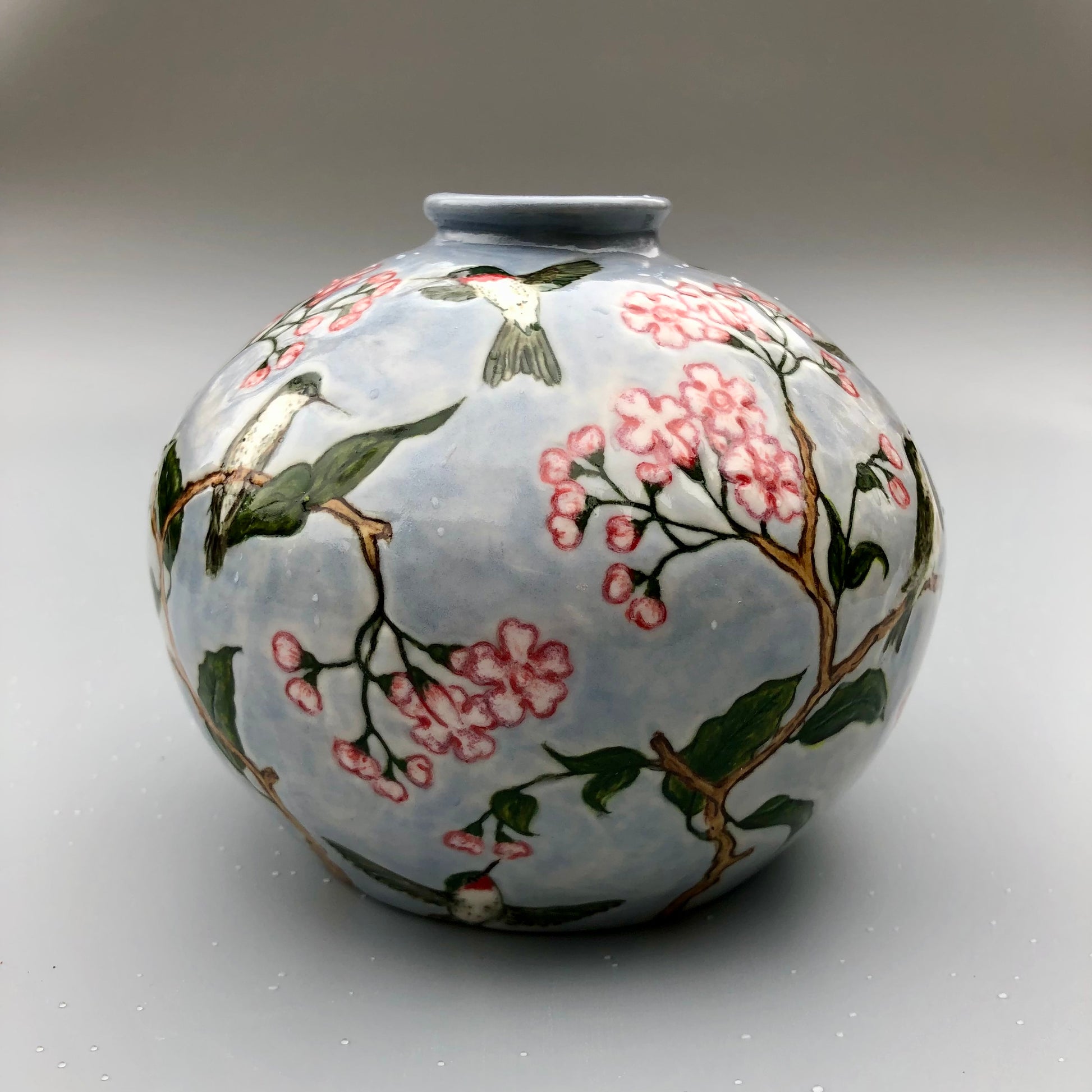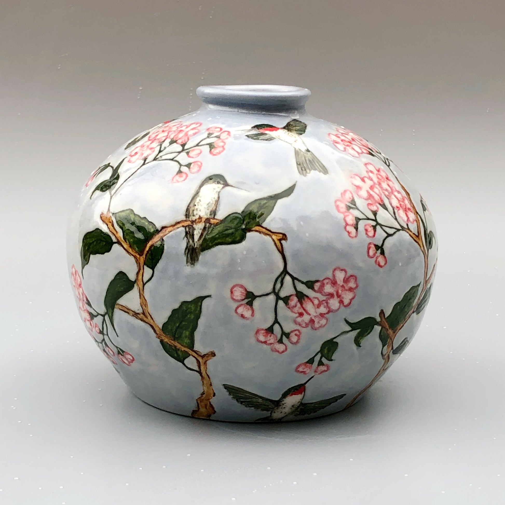 Wheel-thrown porcelain vase, hand-painted with underglazes. Glossy glaze finish.