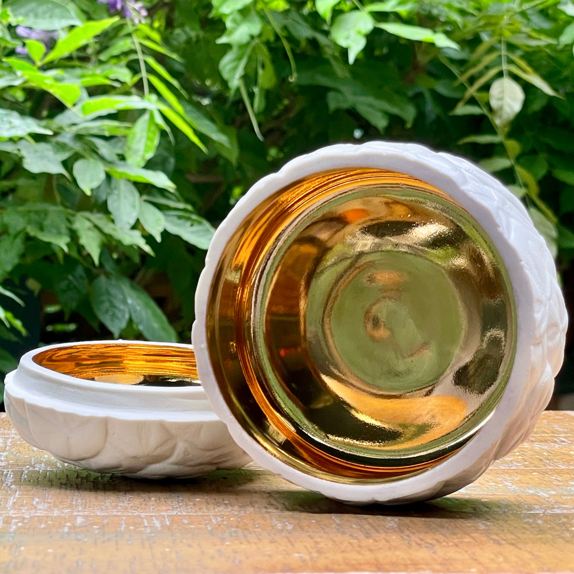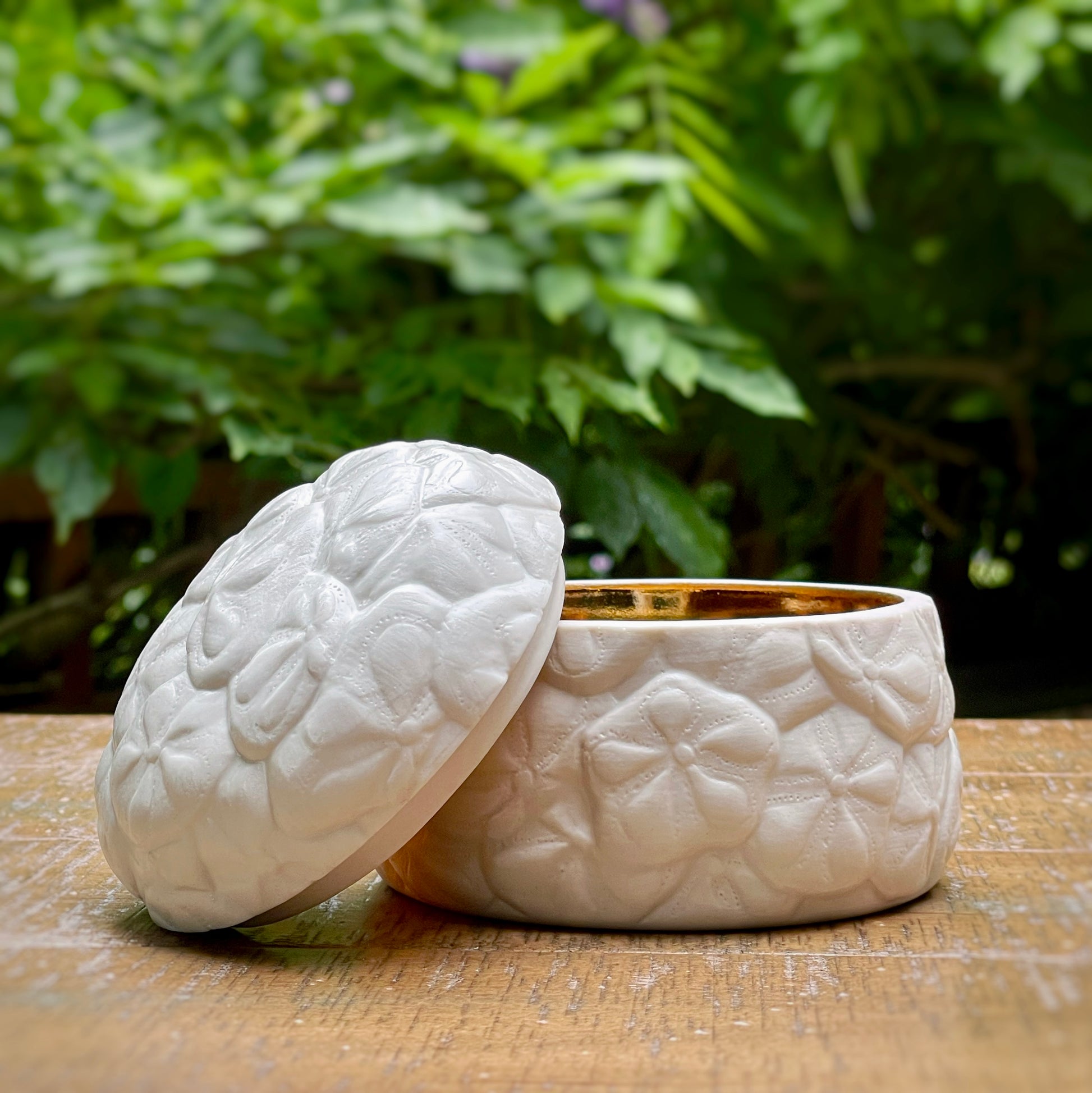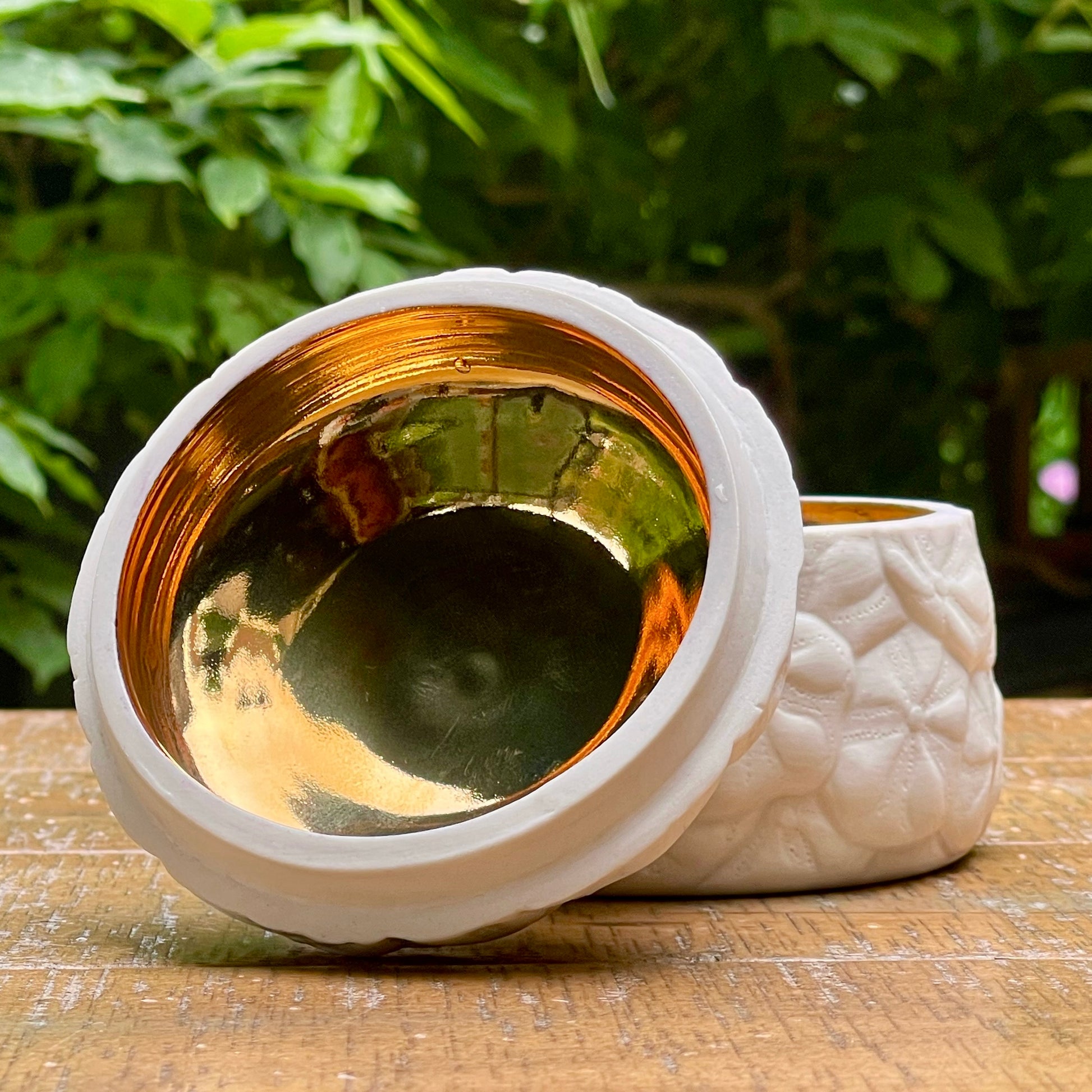 Wheel thrown and hand carved porcelain. 24k gold luster on inside surfaces. Satin matte glaze finish.